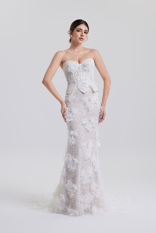The design of Light Luxury 019 centers on three-dimensional flowers and delicate lace, creating a whimsical yet elegant look. The heart-shaped strapless top paired with a fitted corset hugs the body perfectly, accentuating natural curves while exuding timeless elegance. The mermaid-style silhouette further enhances the bride’s figure, flowing smoothly from the waist to the hem for a dramatic and feminine effect.