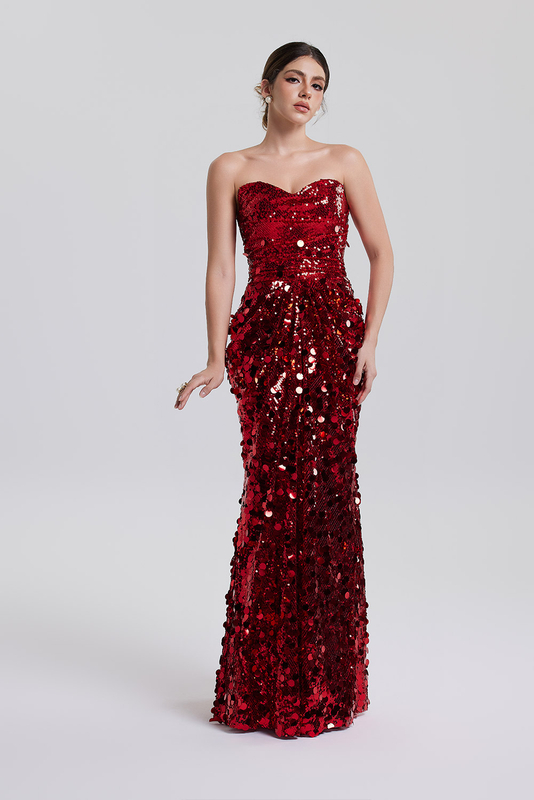 The design, adorned with sparkling sequins, shimmers with dazzling brilliance as the light changes, resembling the sprinkling of starlight, exuding a sense of opulence and grandeur, fully embodying luxury and elegance.