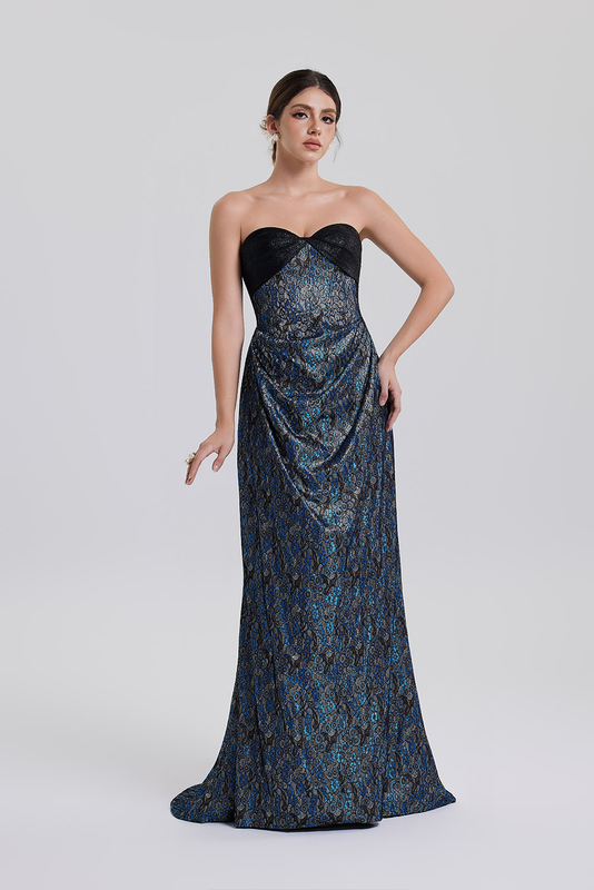 Eye-catching design: strapless and off-the-shoulder, paired with black and blue contrasting colors, featuring a glossy pattern, making it both eye-catching and high-end.