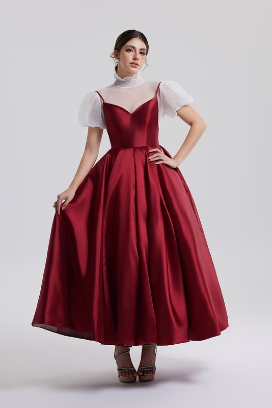 Material texture: The red skirt part is made of glossy fabric, enhancing a sense of luxury; the mesh and puffed sleeve fabric are soft, comfortable to wear, and have a draping effect, providing an overall superior texture.