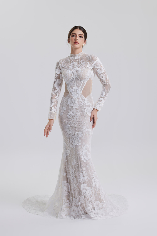 This wedding dress, with classic white as its main color, fully embodies the essence of purity and elegance. The upper part features a see-through lace long-sleeve design, with delicate lace patterns paired with sparkling elements, exuding a romantic and gentle atmosphere in a hazy manner. Meanwhile, the high collar and long sleeves add a sense of dignity. The tight-fitting white bodice effectively outlines the body curve, highlighting the graceful posture of women. The lower part is a fish-tail skirt, swaying gracefully with every step. The lace and sequin details at the hem sparkle under the light, and coupled with the flowing train, the overall look is both noble and elegant, yet full of dreamy and fairy-like charm. It is an excellent choice to interpret romance and happiness at weddings.。