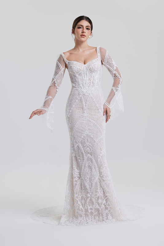 The square neckline design subtly reveals the shoulder and neckline, adding a touch of sexiness and elegance. The long sleeves are made of transparent mesh material, paired with lace patterns, creating a lightweight yet layered look. The flared sleeves add a romantic and vintage charm. The dress is covered with delicate lace patterns, which are exquisite and artistic. Under the light, a subtle shimmer can be seen, making the wedding dress even more gorgeous. The mermaid silhouette perfectly fits the body, fully showcasing the feminine curves, swaying gracefully when walked. The large U-shaped design at the back reveals the beautiful back line, adding a hint of sexiness and charm. The train is light and elegant, adding a sense of ceremony and fantasy to the overall look. It is an excellent choice to interpret romance and happiness at a wedding.